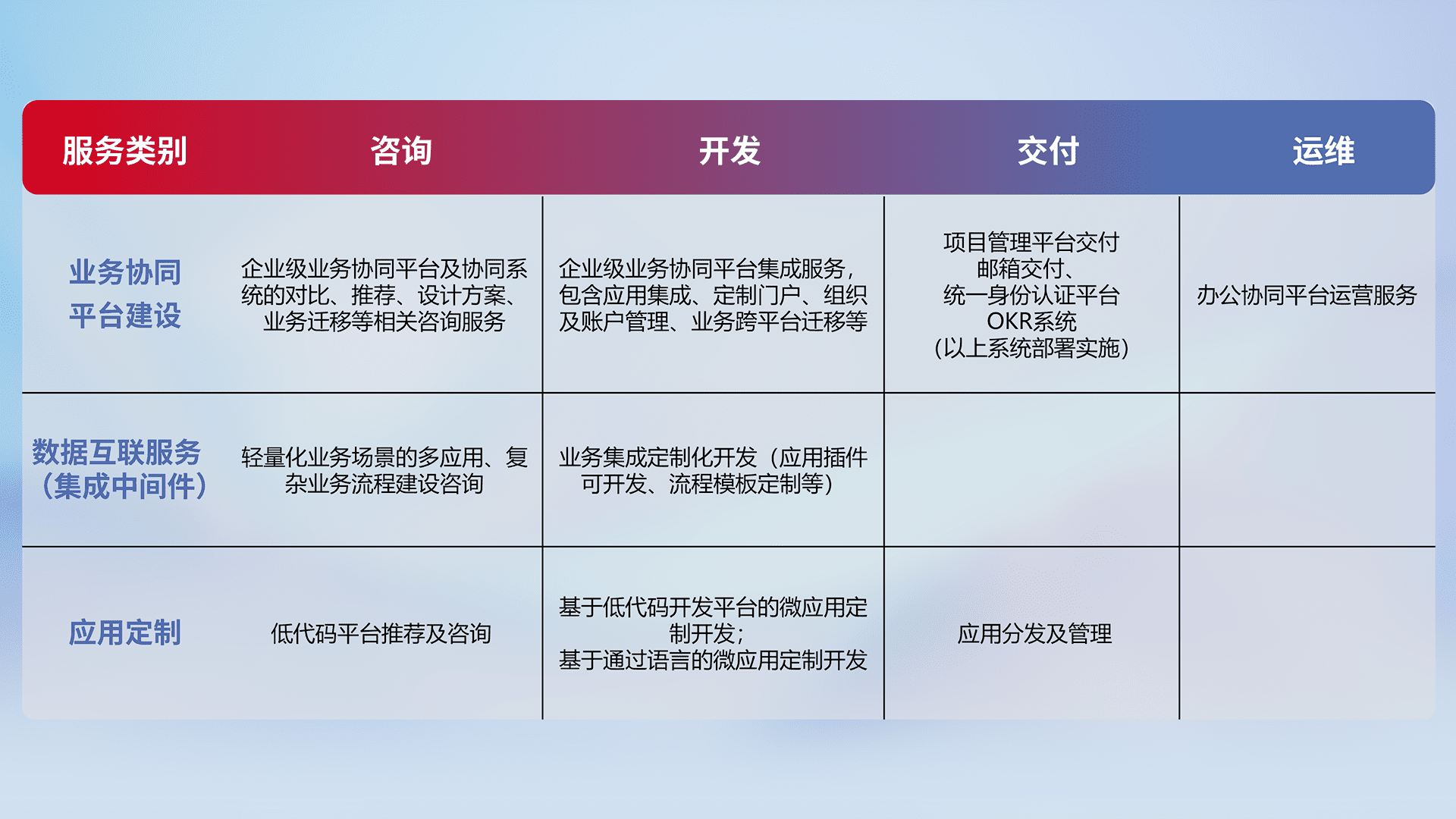 针对钉钉、、、企微、、IDaas等平台级产品提供产品的规划、、方案、、、交付、、、定制化开发等服务,,,实现如统一协同办公、、智能客户服务、、、混合会议管理、、智能数据查询、、、、等业务场景,,实现数字化转型。。。