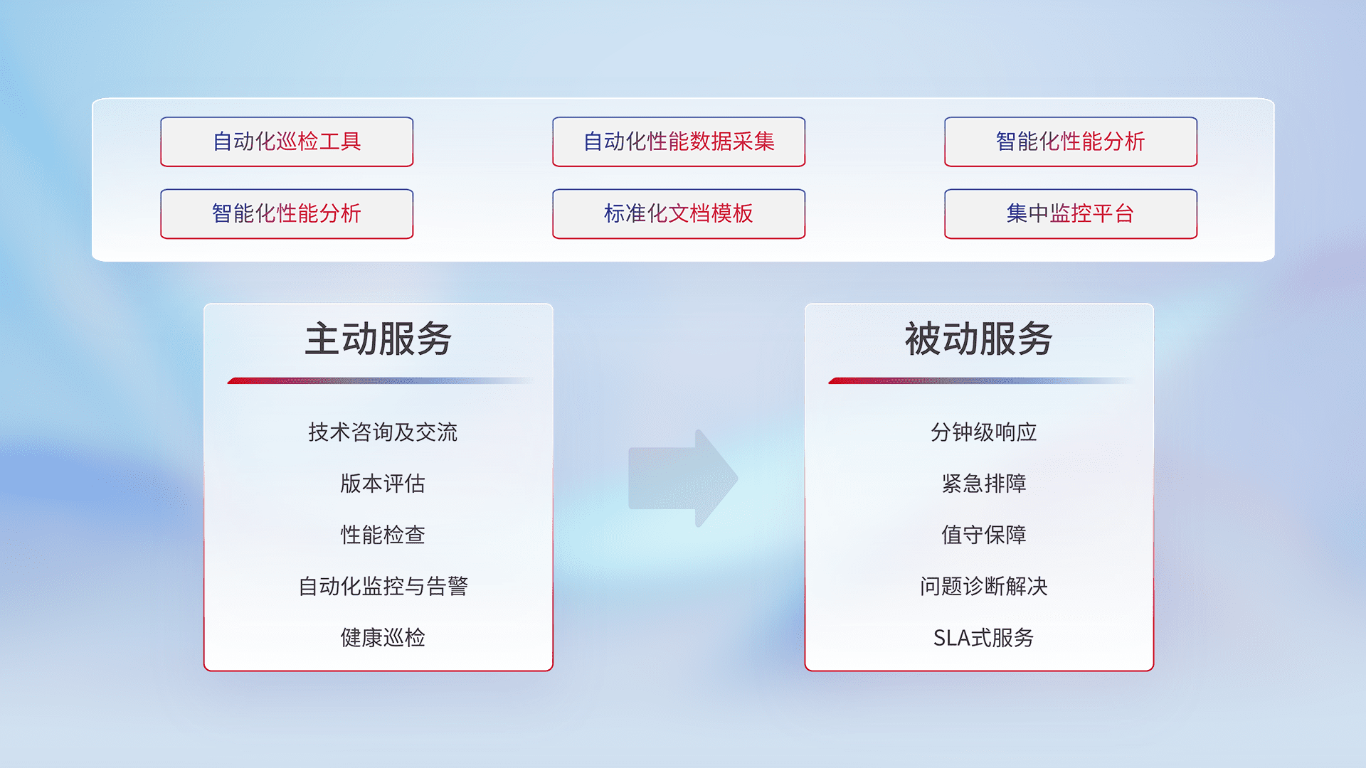 智能化工具和标准化文档,,保障服务质量,,,提供主动服务(包含技术咨询、、版本评估、、性能检查、、、自动化监控与告警、、、健康巡检)和被动服务包含(分钟级响应、、、紧急排障、、值守保障、、、、问题诊断解决、、、、SLA服务)。。。